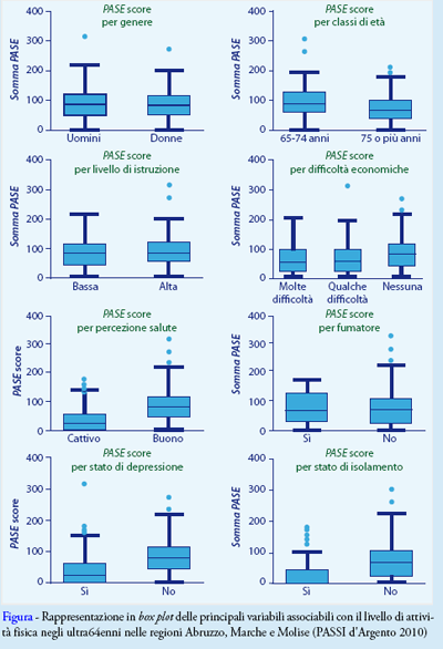 Complessivamente, per le tre regioni sono stati analizzati 679 record, essendo il campione costituito da 305 uomini (45%) e 374 donne (55%), di cui il 51% sotto i 75 anni e il restante 49% oltre. Una descrizione delle distribuzioni di frequenza tramite il box plot viene riportata nella figura, dove si evidenziano differenze significative, con un intervallo di confidenza del 95%, per classi di età (65-74 anni vs 75 o più, p = 0,000); percezione dello stato di salute (buono vs cattivo, p = 0,000); segni di depressione (sì vs no, p = 0,002); livello di istruzione (alta vs bassa, p = 0,03); stato di isolamento sociale (sì vs no, p = 0,000); problemi di vista (sì vs no p = 0,000). Risultano, inoltre, significative (p = 0,000) per le difficoltà economiche percepite (nessuna, qualche difficoltà o molte). A un'analisi multivariata, mediante regressione logistica secondo la metodologia del “miglior modello”, si evidenzia che sono fattori di rischio per livelli inferiori di attività fisica: avere una cattiva percezione dello stato di salute (p = 0,0002), essere più avanti negli anni (variabile continua p = 0,00072). Le altre variabili (sesso, segni di depressione, livello di istruzione, condizione di isolamento sociale, problemi di vista) non sono significativamente associate al livello di attività fisica degli ultra64enni.