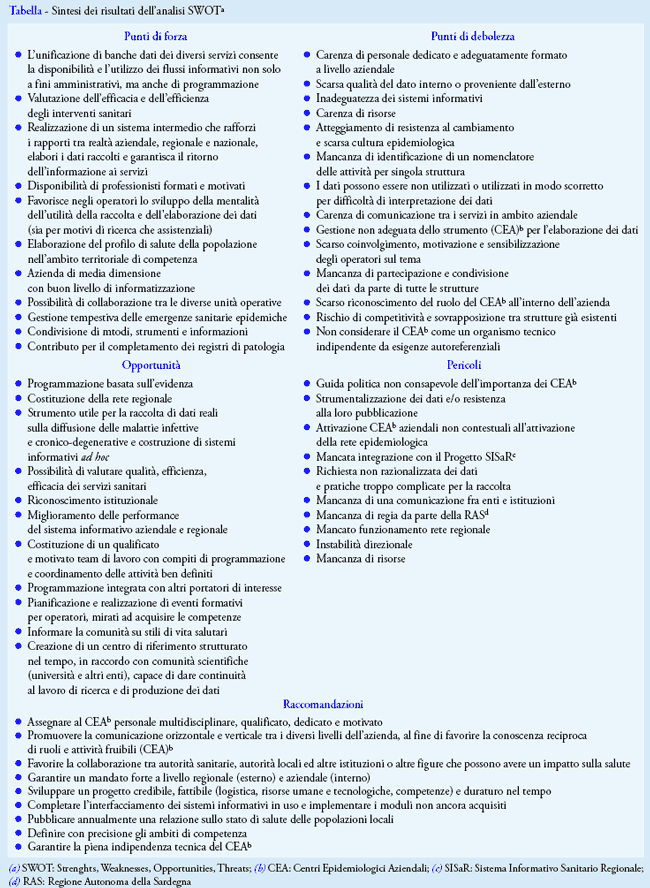 La Tabella sintetizza l’analisi SWOT; i punti sono ordinati con frequenza decrescente in base ai contributi delle 9 aziende sanitarie e della Regione Autonoma della Sardegna.