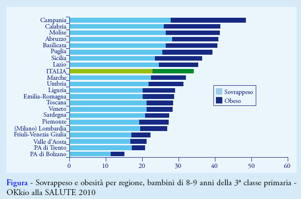 Alla prima rilevazione, condotta nel 2008, hanno aderito tutte le regioni, a eccezione delle province autonome di Trento e Bolzano e della Asl di Milano (unica Asl che ha partecipato per la Lombardia) che hanno svolto la raccolta nel 2009, a causa di un ritardo nell’avvio delle attività. Il successo dell’iniziativa si è ripetuto nella seconda rilevazione del 2010 con la partecipazione di tutte le regioni italiane. Nel 2010 sono state raccolte informazioni su un totale di 42.155 alunni della terza classe primaria (con solo un 3% di rifiuti) e il 95% dei genitori coinvolti ha compilato il questionario, fornendo informazioni sugli stili di vita dei propri figli e sulla propria percezione del problema. I risultati del 2010 non si discostano molto da quelli ottenuti nella raccolta 2008-09 (6). Nel 2010, il 23% dei bambini di 8 e 9 anni è risultato in sovrappeso e l’11% in condizioni di obesità. Rispetto alla prima rilevazione, rimane stabile il sovrappeso e si riduce leggermente, sebbene in maniera non statisticamente significativa, la prevalenza dei bambini obesi (12% nel 2008-09). Si riconferma una spiccata variabilità interregionale, con percentuali tendenzialmente più basse nell’Italia settentrionale e più alte nel Sud (Figura).