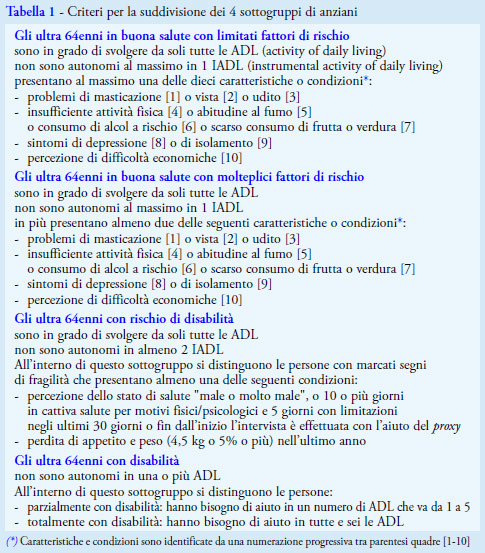Le informazioni raccolte dalla PDA permettono una descrizione della popolazione ultra64enne in 4 sottogruppi (Tabella 1), costruiti su base bio-psicosociale attraverso dei criteri che identificano la capacità di svolgere le attività della vita quotidiana semplici (activity of daily living - ADL) e strumentali (instrumental activity of daily living - IADL) (8).