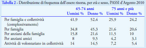 Nel 2010 si è svolta la seconda indagine sperimentale in cui sono state raccolte 5.047 interviste in 9 regioni (Abruzzo, Calabria, Campania, Lazio, Marche, Molise, Piemonte, Sardegna, Veneto). Il campione, di età mediana di 75 anni, con range fra 65 e 101, è costituito nel 57% da donne. Senza differenze di genere apprezzabili, il 36% (IC95%: 34,7-37,5) risulta una risorsa per la famiglia o per la collettività, costituendo un capitale importante per il nostro sistema sociale. Questa proporzione decresce con l’aumentare dell’età (47% nei 65-74enni, 30% nei 75-84enni, 9% negli 85enni e più). Gli intervistati sono impegnati anche nella cura di altri anziani, 19% nel gruppo degli ultra64enni e 11% in quello degli ultra75enni. La Tabella 2 sintetizza le frequenze e le caratteristiche dell’essere risorsa in rapporto a genere ed età.