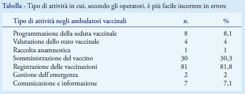 L’analisi dell’organizzazione e della gestione dell’ambulatorio vaccinale può essere utile per capire se la struttura e il personale siano pronti ad affrontare le possibili reazioni avverse a rapida insorgenza. A tal fine, nell’estate 2011, è stato condotto uno studio con l’obiettivo di analizzare la qualità dell’attività vaccinale svolta dagli ambulatori vaccinali (AV) dell’Area Vasta Romagna - AVR (AUSL di Cesena, Forlì, Ravenna e Rimini).