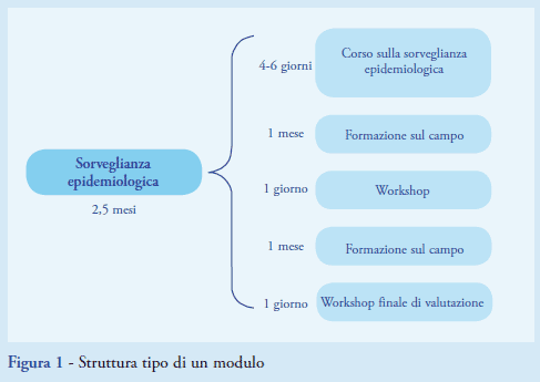 Dopo la fase iniziale di analisi dei bisogni formativi, il percorso del Master è stato strutturato in una serie di moduli che prevedono il potenziamento di competenze sull’epidemiologia applicata. I 12 moduli, di cui 9 obbligatori e 3 opzionali, riguardavano i seguenti argomenti: realizzazione di studi trasversali (M1), indagine epidemiologica e uso della evidence in salute pubblica (M2), profili di comunità e priorità di salute (M3), miglioramento della qualità attraverso i flussi di dati (M4), management dei sistemi di sorveglianza di popolazione (M5), uso avanzato di Epi Info (M6, opzionale), comunicazione epidemiologica e consumo dell’alcol (M7), gestione dei momenti informativi nell’ambito della rete epidemiologica (M8), ideazione e valutazione di un intervento/progetto in salute pubblica, basandosi sulla evidence (M9), metodi di analisi multivariata (M10, opzionale), leadership efficace per la promozione del lavoro di rete (M11, opzionale), intervento su situazioni epidemiologiche locali (M12).