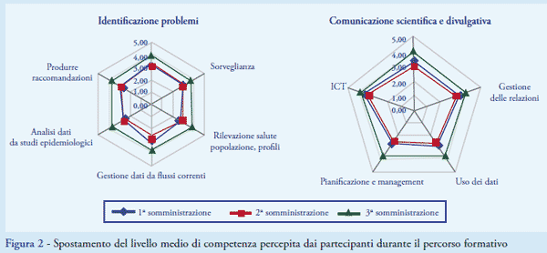 Gli oggetti della valutazione sono stati la competenza percepita, le conoscenze sui temi proposti, la pratica epidemiologica, la partecipazione alle attività della CoP e la condivisione di strumenti e materiali. La competenza percepita è stata valutata utilizzando il questionario prodotto dai Centers for Disease Control and Prevention/Council of State and Territorial Epidemiologists (cdc/ CSTE) (1), adattato ai bisogni formativi locali e somministrato all’inizio, a metà e a fine percorso. L’analisi è stata basata sul modello teorico di Thomas Gordon, che suddivide l’apprendimento della competenza in 4 stadi distinti (2).