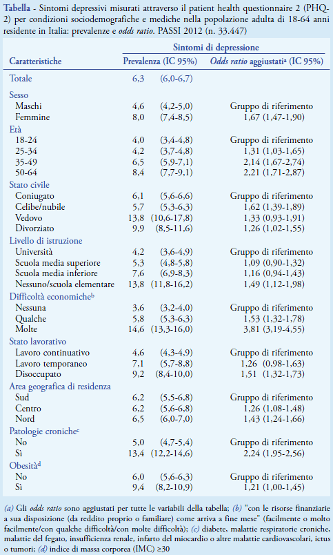 Nel 2012, la prevalenza dei sintomi di depressione tra gli adulti di 18-64 anni residenti in Italia è del 6,3% (IC 95%: 6,0- 6,7). Questo valore è più elevato in alcuni gruppi di popolazione, come ad esempio nelle donne (8,0%), nei più anziani (8,4%), in chi è divorziato o vedovo (rispettivamente 9,9% e 13,8%), negli intervistati con un livello di istruzione elementare o senza alcun titolo di studio (13,8%), in quelli che dichiarano di arrivare a fine mese con molte difficoltà economiche (14,6%), nei disoccupati (9,2%), nelle persone con almeno una patologia cronica (13,4%) e negli obesi (9,4%) (Tabella).