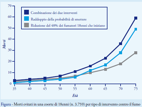 3. raddoppio dell’attuale probabilità di smettere di fumare in tutte le età; questa ipotesi è stata formulata in accordo a quanto previsto in studi simili (6, 7);