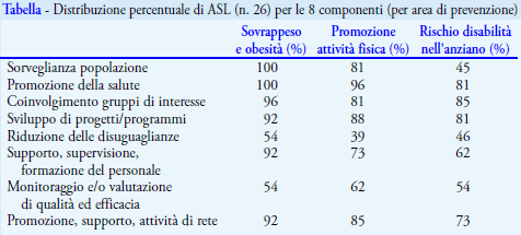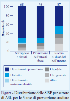 SUMMARY (Survey of organization and performance of public health services involved in preventive health activities, Italy 2010-12) - A web based survey on a convenience sample of 26 local health authorities (LHA) was carried out in 17 Italian regions to describe organization and performance of local services in charge for preventive health activities in three selected areas, prevention of overweight and obesity, disability in the elderly and promotion of physical activity. While the majority of LHA referred working population surveillance systems and health promotion activities, approaches to control inequalities and plans to monitor performance quality were less represented.