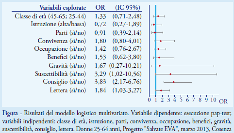 SUMMARY (“Save EVE”: cytological screening and reasons for non-adherence in Calabria) - In March 2013, a random sample of 295 women aged 25-64 years residing in the local health authority of Cosenza was selected to assess adherence to the pap-test screening offered by the public health system and to identify reasons for non-adherence in order to improve effectiveness of communication campaigns. In multivariate data analysis risk perception (OR 3.29, p = 0.0449), medical advice (OR 3.83, p = 0.0000) and invitation letter (OR 1.84, p = 0.0137) were found associated to screening adherence. Targeting next communication campaign to healthcare professionals and to increase risk awareness in women would be strongly advised.