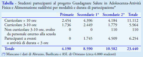 SUMMARY (The Italian National Project Guadagnare Salute in Adolescence - Physical Activity and Healthy Eating) - The project aimed to promote physical activity and healthy eating among teenagers, helping regional local partners to set up interventions with larger effectiveness. The main strategies were: disseminating best practices, training health professionals trainers, promoting a Community of Practice. Three best practices were proposed to several regions that were offered 21,000 euro as start up grant. Fifteen out of 20 regions adhered to the project. Training involved 322 health workers and 1,170 teachers. Nearly 29,000 students actively participated in the project, among which 11,000 have taken part in a 10-hours education program.