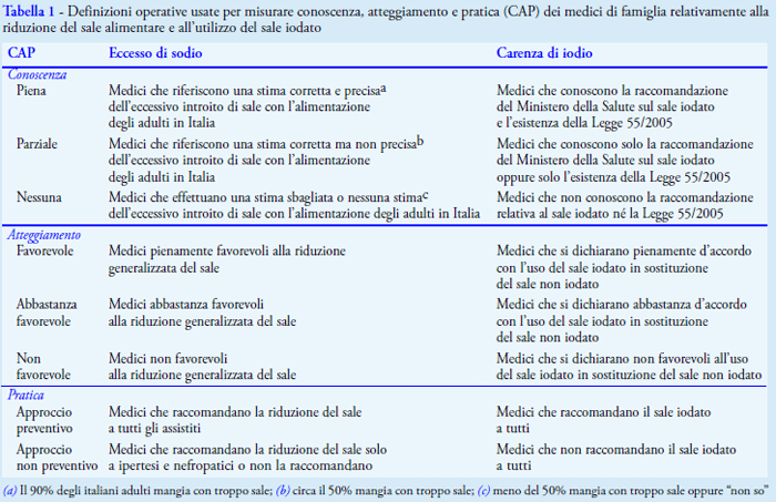Dal momento che sono ben poche le conoscenze relative alle convinzioni dei medici di famiglia in merito al sodio e allo iodio nell’alimentazione degli italiani, è stata realizzata un’indagine su conoscenze, atteggiamenti e pratica dei medici di famiglia relativamente all’assunzione di tali elementi con gli alimenti.