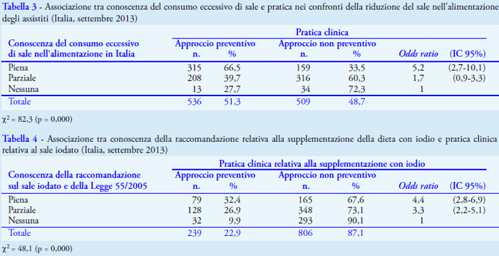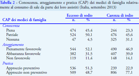 I risultati di questa indagine evidenziano che gli atteggiamenti dei medici di famiglia e la pratica di raccomandare a tutti gli assistiti di consumare "meno sale ma iodato" sono associati alle loro conoscenze. Tuttavia, la frequenza di medici con una conoscenza piena dell’eccesso di sodio nell’alimentazione degli italiani e la frequenza di quelli che conoscono la raccomandazione sul sale iodato e la Legge 55/2005 sono risultate insufficienti, tra i rispondenti all'indagine: meno di 1 su 2 conosceva bene la situazione dell’eccesso di sodio e meno di 1 su 4 la raccomandazione e la legge sul sale iodato. Alla fine, solo la metà dei medici ha un “approccio preventivo” relativamente alla riduzione di sale e solo il 22,9% ha un “approccio preventivo” in relazione al sale iodato. Se tali frequenze fossero confermate, sarebbe necessario ripensare alcuni aspetti della strategia adottata. Infatti, una strategia completa, oltre alla riformulazione e alla regolamentazione dei prodotti alimentari, che rendano disponibili cibi con minor contenuto di sodio e che siano preparati con sale iodato, include un’altra essenziale componente: la consapevolezza della popolazione (11) che può essere migliorata solo con l’appoggio dei medici di famiglia.