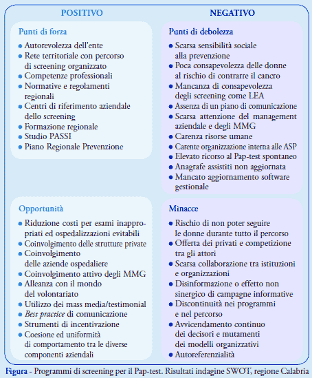 SUMMARY (Screening programs for cervical cancer: a SWOT investigation in Calabria Region) - In this study, the low adherence to screening programs for cervical cancer in Calabria was studied by performing a SWOT analysis with a selected number of health professionals. Although women are offered the cervical screening within the regional health system, human and financial resources are not sufficient to promote the screening and service health management has to be improved. In that perspective, it would be appropriate to invest in health promotion strategies and more effective communication, overcoming the potential cultural factors that hinder adherence.
