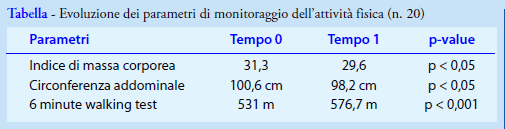 I parametri (Tabella) sono stati rilevati al momento dell’ arruolamento (tempo 0) e, rivalutati a distanza di otto mesi (tempo 1), sono risultati tutti migliorati: l'IMC medio del campione è passato da 31,3 kg/m² a 29,6 kg/m² (riduzione media pari 1,7 kg/m²; p <0,05,) la CA media si è ridotta da 100,6 cm a 98,2 cm (riduzione media pari a 2,4 cm; p <0,05), il 6 MWT ha evidenziato un aumento medio della distanza percorsa da 531 m a 576,7 m (incremento medio di 45,7 m; p <0,001).