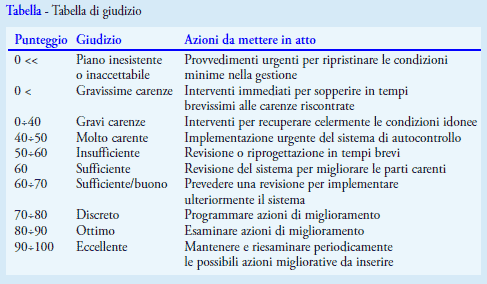Il punteggio totale è elaborato automaticamente con un foglio di calcolo elettronico, attraverso formule di logica che hanno lo scopo di assegnare valori univoci alle risposte della checklist, eliminando ogni rischio di errore casuale nella fase di computo e fornendo ripetibilità al sistema (5). Il valore matematico ricavato è trasformato in un giudizio di merito del piano di autocontrollo, attraverso una Tabella che indica la priorità delle azioni da mettere in atto.