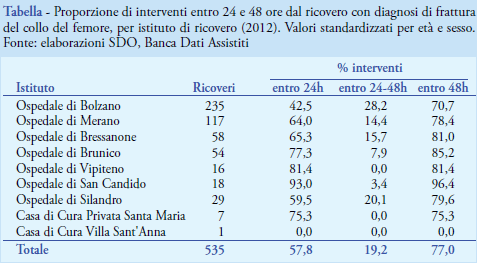 Sono stati estratti, dalla banca dati delle schede di dimissione ospedaliera, tutti i ricoveri nella PA di Bolzano, per il 2012, secondo i seguenti criteri: ricoveri ordinari per acuti (primo episodio) di pazienti residenti tra 65 e 100 anni, con diagnosi principale o secondaria di frattura del collo del femore (codici ICD9-CM 820.0x- 820.9x). Non sono stati considerati i ricoveri per trasferimento da altra struttura, i ricoveri di politraumatizzati (DRG 484, 485, 486, 487), di pazienti deceduti entro le 48 ore senza intervento (si presume che in tali casi la situazione clinica per questi pazienti fosse incompatibile con un intervento chirurgico) e i ricoveri con diagnosi principale o secondaria di tumore maligno (codici ICD9-CM 140.0x-208.9x) nel ricovero in esame o nei due anni precedenti. Per i ricoveri selezionati si è calcolata la proporzione di interventi chirurgici a seguito di frattura del collo del femore avvenuti entro 24 e 48 ore dal ricovero in ospedale, dove gli interventi considerati (principali o secondari), sono stati individuati dai codici di sostituzione protesica totale o parziale (codici ICD9-CM 81.51, 81.52) o di riduzione di frattura (codici ICD9-CM 79.00, 79.05, 79.10, 79.15, 79.20, 79.25, 79.30, 79.35, 79.40, 79.45, 79.50, 79.55) o di fissazione interna senza riduzione di frattura (codici ICD9-CM 78.55). Il dato relativo alla proporzione entro le 48 ore è stato confrontato con quello delle altre strutture italiane, calcolato dal PNE.