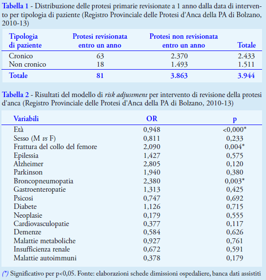 I dati sugli impianti di protesi d’anca sono disponibili nel Registro Provinciale delle Protesi d’Anca (RPPA) della provincia autonoma (PA) di Bolzano che partecipa attivamente al progetto “Registro Italiano ArtroProtesi”, coordinato dall’Istituto Superiore di Sanità. L'RPPA è stato istituito a partire dal 1° gennaio 2010 e raccoglie in modo sistematico e anonimo, i dati demografici dei pazienti, i dati clinici dell’intervento e i dati specifici dei dispositivi impiantati. I dati clinici disponibili dall’RPPA sono stati integrati con quelli presenti nelle schede di dimissione ospedaliera, mentre le patologie croniche sono state identificate attraverso il progetto “Mappatura delle patologie croniche” che, sulla base di informazioni anagrafiche epidemiologiche ed economiche relative a ciascun assistito, ha portato a identificare 14 profili di cronicità differenti, tra cui il diabete, la broncopneumopatia (BPCO), lo scompenso cardiaco, le demenze e le neoplasie (6). La coorte è stata quindi definita da tutti i ricoveri di pazienti, con un intervento di protesi primaria (tipo di protesi totale o parziale) con data di intervento dal 1° gennaio 2010 al 31 dicembre 2013 nella PA di Bolzano. L’esito con modalità dicotomica, associato a ciascun ricovero, è stato definito dalla presenza o meno di un successivo intervento di revisione entro 1 anno dalla data di intervento. Attraverso il test χ2, si è valutata l’esistenza di un’associazione statistica tra l’esito e la presenza o assenza di patologie croniche. La successiva stima dell’odds ratio (OR) ha consentito di valutare la pro-pensione al rischio di una revisione associata ai pazienti cronici rispetto a quelli non cronici (7); attraverso la procedura di risk adjustment, si sono poi confrontati queste due differenti tipologie di pazienti, in relazione al rischio di subire una revisione sulla base di una serie di fattori selezionati a priori, quali il genere, l’età, la frattura del femore come prima causa dell’intervento e le cronicità considerate, sulla base di un modello di regressione logistica (8).