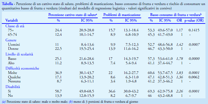 Nel Lazio, delle 2.011 persone con 65 anni e più, il 17,7% (IC95% 15,7-19,7) riferisce un cattivo stato di salute. La percezione di cattiva salute è più frequente tra le persone con 75 anni e più rispetto alla classe d’età 65-74 anni (24,4% vs 12,4%), nelle donne (22,5% vs 11% negli uomini), tra le persone con basso livello di scolarità (nessun titolo/elementare/media inferiore: 25,1%, media superiore/laurea: 11,2%) e con difficoltà economiche (molte: 36,9%, qualche: 17,1%, nessuna: 8,7%). I problemi di masticazione riguardano il 12,2% (IC95% 10,6-13,9) delle persone con 65 anni e più. Questa percentuale è più alta tra le persone con basso livello di scolarità (nessun titolo/elementare/ media inferiore: 17,0%, media superiore/laurea: 7,4%), tra chi riferisce difficoltà economiche (molte: 22,0%, qualche: 8,6%, nessuna: 3,4%), e tra le persone con disabilità (36,6% vs 8,2% tra coloro che non hanno disabilità). Nei 12 mesi precedenti si è recato dal dentista il 42,6% delle persone con 65 anni e più (il 32,5% tra coloro che presentano problemi di masticazione). Per quanto riguarda il consumo di frutta e verdura, solo l’8,9% consuma le 5 porzioni raccomandate di frutta e verdura, il 41,9% ne consuma almeno 3, il 49,2% meno di 3 al giorno. Il consumo basso di frutta e verdura (inferiore a 3 porzioni al giorno) è maggiore tra le persone con 75 anni e più rispetto alla classe d’età 65-74 anni (53,3% vs 45,3%), tra gli uomini (52,7% vs 46,7% nelle donne), tra le persone con basso livello di scolarità (nessun titolo/ elementare/media inferiore: 57,3% vs media superiore/laurea: 41,1%) e con difficoltà economiche (molte: 60,6%, qualche: 47,1%, nessuna: 41,2%). Utilizzando un modello di regressione logistica (Tabella), si rileva che il consumo insufficiente di frutta e verdura è più frequente tra gli uomini rispetto alle donne (OR 1,42 IC95%: 1,16-1,75), tra le persone con basso titolo di studio rispetto a quelle più istruite (OR 1,78 IC95%: 1,44-2,2), tra le persone con molte difficoltà economiche rispetto a coloro che non ne riferiscono (OR 1,83 IC95%: 1,34-2,49) e tra le persone con disabilità (OR 2,6 IC95%: 1,50-3,42).