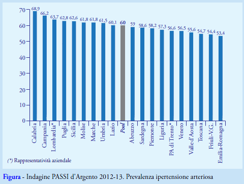 SUMMARY (Hypertension in over64 aged population and associated factors: data from PASSI d’Argento surveillance, 2012-13) - Elderly population is heavily affected by hypertension with prevalence increasing with age; excessive sodium intake, overweight/obesity and lack of physical activity are well known risk factors. During the years 2012-13, PASSI d’Argento, an Italian nationwide over64 aged population surveillance, estimated a hypertension prevalence of 60% (CI 95%: 59.1-60.8) with a wide range (53.4%-68.9%) among the 19 participating regions. A logistic regression showed that women (OR 1.29 p < 0.05), age over 74 years (OR 1.32 p < 0.05), difficulties in making ends meet (OR 1.21 p < 0.05), being overweight/obese (OR 1.65 p < 0.05), insufficient physical activity levels (OR 1.23 p < 0.05) are associated to hypertension. The information produced by the surveillance can be helpful for programming actions aiming at the prevention and the control of hypertension, namely for targeting at risk population groups.