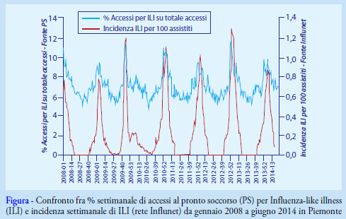 SUMMARY (Integrated surveillance of Influenza-like illnesses (ILI) in Piedmont region, Italy) - Different surveillance networks pro-vide data on Influenza-like illnesses (ILI) in Italy. Comparing data from Influnet surveillance network with First Aid syndromic surveillance showed maximum seasonal values from 2008-09 to 2013-14 in Piedmont region. ILI epidemic trends in regional population and the estimate of the use of public services for the diagnosis and therapy of ILI are useful tools for planning regional health services.