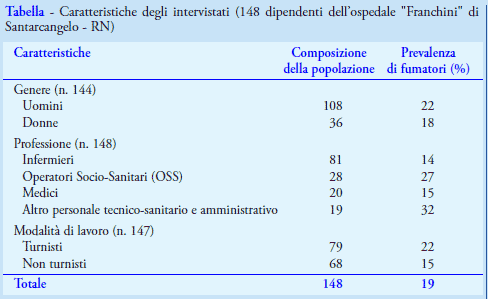 Sono stati compilati 148 questionari (87% del totale): i dipendenti hanno un’età media di 47 anni (range tra 29 e 64 anni), sono prevalentemente donne (73%) e lavorano in ospedale in media da 13 anni (range da 1 a 38 anni). Per quanto riguarda la prevalenza di fumatori tra i dipendenti, la percentuale di chi fuma abitualmente sigarette risulta pari al 19%, mentre quella degli ex fumatori è pari al 25%. I fumatori dichiarano di consumare in media 11 sigarette al giorno (range da 1 a 30) e di fumare in media da 23 anni. In base al test di Fagerström, il 43% dei fumatori ha un grado di dipendenza lieve, il 18% forte e nessun fumatore molto forte. A circa il 60% dei fumatori è stato consigliato di smettere di fumare: solo nel 14% dei casi il consiglio proveniva dal medico competente, mentre nel 36% dai colleghi. Il 79% dei fumatori dichiara di aver provato a smettere di fumare almeno una volta nella vita (il 50% ha provato più di una volta). Pensando all’ultima volta che il fumatore ha tentato di smettere, i due fattori che più frequentemente l'hanno spinto a questa scelta sono stati: la preoccupazione per la propria salute attuale (55%) e l’essere in gravidanza o allattamento (36%). Nessun fumatore ha mai partecipato a incontri o corsi che aiutano a smettere di fumare organizzati dall’AUSL; il 46% dichiara di non essere a conoscenza della loro esistenza, il 29% ritiene che non servano e il 21% dichiara che si svolgono in orari o luoghi che ne rendono difficoltosa la partecipazione (Tabella).