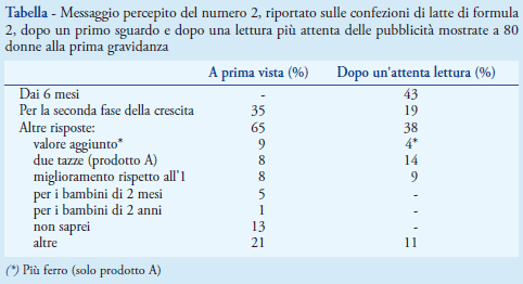 Fase qualitativa - Le 80 donne intervistate avevano un’età media di 32 anni (range: 20-42), il 56% aveva una laurea o più e circa il 2,5% era straniera. Dalle interviste è emerso che le donne sono confuse dal numero 2 riportato sulle etichette poiché hanno lo stesso formato e l'età dei bambini ritratti nella confezione è indefinita. Dopo un primo sguardo, solo una donna ha associato correttamente la pubblicità con il latte di proseguimento, mentre il 65% delle donne non era in grado di attribuire il significato corretto al numero 2. Inoltre, le donne hanno avuto difficoltà anche a stimare correttamente la presunta età del bambino. Il 20% delle donne che ha guardato la pubblicità A riteneva, infatti, che il bambino ritratto avesse tra 2 e 4 mesi, e il 39% tra 5 e 6 (contrariamente ai 7 mesi dichiarati sulla pubblicità). L’immagine del latte B è risultata invece meno confondente e infatti il 76% riteneva, correttamente, che il bambino avesse più di 7 mesi. Per il 52% delle gravide che hanno risposto alla domanda “quale madre può trovare utile questo prodotto ?” (46 su 80), il prodotto era ritenuto utile per le madri senza latte materno o non disposte ad allattare, per il 24% per le madri lavoratrici, per il 13% per le madri che decidono di interrompere l'allattamento, e per il 7% quando il latte materno non è sufficiente.