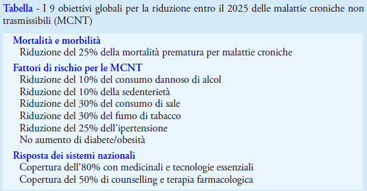 La sfida per i sistemi sanitari dei Paesi occidentali è quella di contenere l’impatto delle malattie croniche non trasmissibili (MCNT). L’Organizzazione Mondiale della Sanità (OMS) ha formulato delle strategie globali, finalizzate alla riduzione entro il 2025 del 25% della mortalità prematura per malattie croniche, attraverso la copertura della popolazione con farmaci, tecnologie sanitarie e counselling, ma soprattutto attraverso la riduzione dei principali determinanti delle MCNT (Tabella).