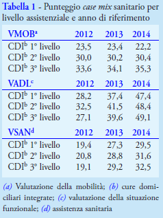 Abbiamo analizzato il case mix sociosanitario degli assistiti (ossia la complessità della casistica in termini di compromissione clinico/funzionale e sociale) nel triennio 2012-14 e i dati di attività del personale operativo nei progetti di CDI. I dati sono stati ottenuti dal sistema informativo EDOTTO, il sistema informativo sanitario della regione Puglia, entrato a regime a partire dal 2012 (3). Esso comprende oltre 30 aree applicative che condividono basi informative di livello regionale e include l’assistenza domiciliare con le CDI di primo-terzo livello, le cure domiciliari palliative (CDP), l’assistenza domiciliare programmata (ADP). I dati estrapolati da EDOTTO hanno riguardato i PAI in corso (per ogni anno del triennio considerato) relativi agli assistiti residenti nei 4 Comuni dell’ambito territoriale del Distretto Socio Sanitario n. 1 della ASL di Taranto (Castellaneta, Laterza, Ginosa, Palagianello), la cui popolazione ammonta, complessivamente, a 63.086 individui (dati ISTAT al 1° gennaio 2015). Sono stati considerati i PAI per CDI di primo, secondo e terzo livello, escludendo le CDP e l’ADP. Per valutare il case mix sociosanitario, ci si è basati sui punteggi relativi a 4 dimensioni ricavabili dalla scheda di valutazione multidimensionale dell’anziano (SVAMA) (4):