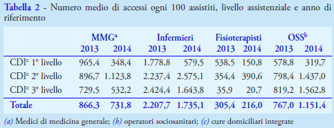 Bisogna, inoltre, sottolineare che, nonostante l'arco temporale considerato sia breve, la popolazione anziana è aumentata di 681 individui dal 2012 al 2014 e anche questo, seppur in misura minore, potrebbe aver influito sull'aumento dei casi assistiti. Se il numero totale di accessi aumenta per l’aumento dei casi assistiti, dall’altro si registra una riduzione della frequenza di accesso media ogni 100 assistiti per il personale infermieristico nelle CDI di terzo livello (1.643 accessi nel 2014 vs 2.424 accessi nel 2013), che sono quelle a più alta complessità e che hanno registrato il maggior incremento (Tabella 2).