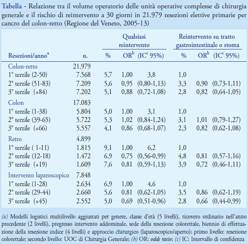 (*) Il presente contributo, benché elaborato con un'ottica di particolare attenzione per la metodologia dell’indagine, attinge largamente ai dati presentati nell’articolo: Pucciarelli S, Chiappetta A, Giacomazzo G, et al. Surgical Unit volume and 30-day reoperation rate following primary resection for colorectal cancer in the Veneto Region (Italy). Tech Coloproctol 2016;20(1):31-40.