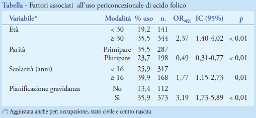 Il 93,6% ha assunto AF in gravidanza; il 30,7% nel periodo raccomandato (almeno un mese prima del concepimento e per il primo trimestre di gravidanza), con un range per centro nascita dal 27,0% al 36,1%. L’aver programmato o non escluso la gravidanza (35,9% vs 13,4%; ORagg=3,19, p <0,01), l’età di 30 anni o più (35,5% vs 19,2%; ORagg=2,37, p <0,01) e l’avere 15 anni o più anni di scolarità (39,9% vs 25,9%; ORagg=1,77, p=0,01) sono associati a un maggior uso periconcezionale di AF. L’essere pluripara (23,7% vs 35,5%; ORagg=0,49, p <0,01) è associato a un minor uso (Tabella).