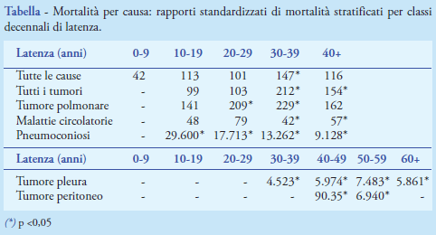 Nel periodo 1972-2012 sono stati osservati 232 decessi: 12 tra gli 89 ex lavoratori assunti dopo il 1972 e 220 tra i 325 ex lavoratori già presenti a quella data. Sono stati calcolati i seguenti RSM: tutte le cause, RSM = 120 (IC 95% 105-136); tutti i tumori maligni, RSM = 194 (IC 95% 159-237); tumore maligno del polmone, RSM = 201 (IC 95% 146-276); tumore maligno della pleura, RSM = 4.033 (IC 95% 2.541-6.401); tumore maligno del peritoneo, RSM = 2.945 (IC 95% 1.404- 6.177); tumore maligno dell’apparato digerente, RSM = 140 (IC 95% 94-207); malattie dell’apparato respiratorio, RSM = 345 (IC 95% 261-456); pneumoconiosi, RSM = 13.268 (IC 95% 9.481-18.570); malattie dell’apparato circolatorio, RSM = 64 (IC 95% 47-88).