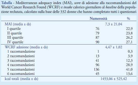 Lo studio è stato approvato dal Comitato Universitario di Bioetica dell’Università di Perugia (Protocollo n. 2015-002). Il reclutamento della popolazione è stato su base volontaria; criteri di inclusione sono stati l’aver avuto diagnosi di CM e il possedere un indirizzo di posta elettronica. Non venivano richieste altre competenze informatiche. Il progetto è stato presentato con varie conferenze pubbliche. Alle donne interessate è stato fornito l’indirizzo del sito (www.dianaweb.org), allestito ad hoc, dal quale scaricare l’informativa e il modulo di consenso informato. Il sito è composto da una parte pubblica e una privata. Nella prima sono disponibili informazioni scientifiche sul CM e consigli su nutrizione e attività fisica, mentre nella seconda le donne hanno a disposizione una chat in cui confrontarsi con i ricercatori sulle novità scientifiche, un calendario delle attività (corsi di cucina, conferenze, ecc.) e dei consigli nutrizionali dispensati anche tramite ricette. Inoltre, la sezione privata contiene i questionari su stile di vita, dati anamnestici, antropometrici, clinici e laboratoristici (ad esempio, livelli ematici di testosterone e insulina). Dai dati ottenuti è stato possibile calcolare l’indice di mediterraneità (mediterranean adequacy index, MAI) (7) e l’adesione alle raccomandazioni del World Cancer Research Fund, WCRF) (8).