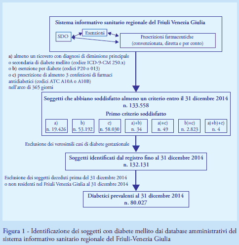 SUMMARY (Use of Friuli Venezia Giulia health information system for the construction of a regional register of persons with diabetes) - The administrative databases of the regional health information system of Friuli Venezia Giulia were used to build a regional registry of the resident population with diabetes mellitus, through an algorithm taking into account hospital discharge data, drug prescriptions, and exemptions from copayments. The registry includes an anonymous univocal identifier and the incidence date (i.e., the first event in the health databases). This registry allows not only to estimate the incidence rate and prevalence of diabetes mellitus in the region, but also to identify cohorts to study different issues related to the disease.