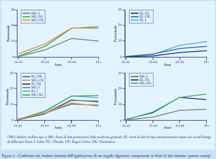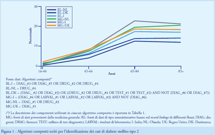 Popolazione e disegno di studio - La popolazione di studio in ognuno dei 6 database corrispondeva a tutti i soggetti attivi al 1° gennaio 2012 (data indice) che a quella data avevano più di 15 anni d’età. È stato effettuato uno studio descrittivo, trasversale, retrospettivo, multidatabase in cui, in ciascuna fonte di dati, sono stati individuati i pazienti con DM2 attraverso l’applicazione di differenti combinazioni logiche di algoritmi d’identificazione. L’applicazione degli algoritmi utilizzava tutto il tempo persona a disposizione per ciascun individuo prima della data indice.