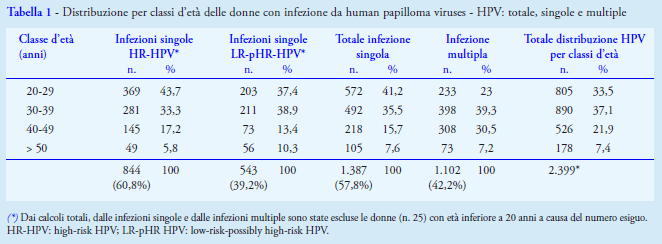 Nelle donne positive al test per più genotipi (infezione multipla), il valore più elevato si registrava nella classe 30-39 anni (39,3%). Nella Tabella 1 non sono riportati i dati relativi alle donne con monoinfezione e coinfezione di età inferiore a 20 anni (n. 25/2.424), per l’esiguità numerica rispetto agli altri gruppi analizzati.