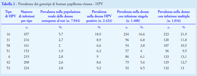 Su un totale di 7.944 donne sottoposte al test, 2.424 erano positive per HPV DNA, con una prevalenza del 30,5% (IC 95% 27,38-33,77), mentre 5.520 (69,5 %) erano negative. Tra le donne positive, il 58,1% (n. 1.408) era infetto da un solo tipo di HPV, mentre il 41,9% (n. 1.016) presentava infezioni multiple.