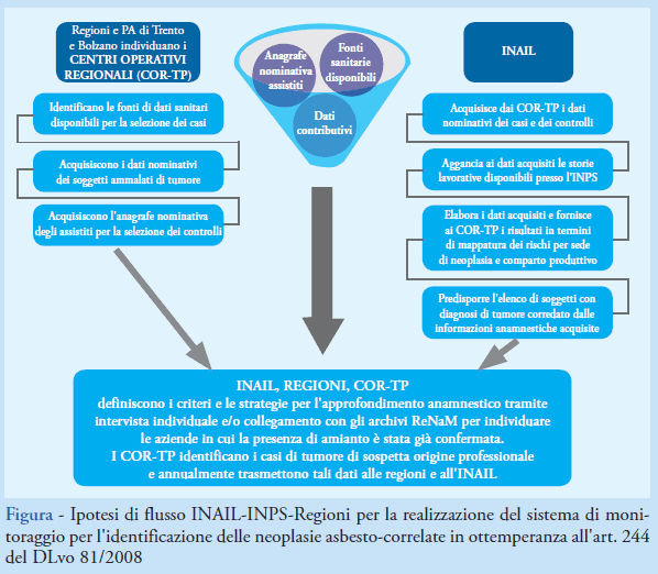 Per quanto riguarda le neoplasie a più bassa frazione eziologica che possano essere attribuite a esposizione ad amianto, ancora molto si deve fare. L’obiettivo di questo studio è descrivere il sistema di monitoraggio dei rischi occupazionali, utile per l’emersione delle neoplasie amianto-correlate, secondo quanto previsto dal comma 1 dell’articolo 244 del DLvo n. 81 del 2008; si vogliono inoltre, presentare i primi risultati di uno studio pilota condotto in alcune regioni italiane.