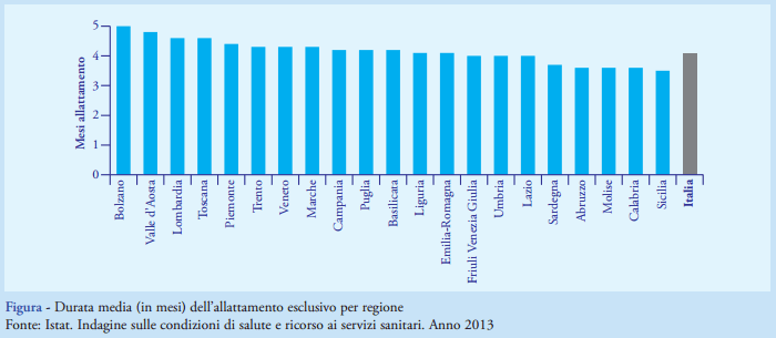 In Italia, la durata media dell’allattamento esclusivo è pari a 4,1 mesi, con differenze regionali che evidenziano durate più brevi in molte regioni del Mezzogiorno (Figura), in particolare in Sicilia (3,5 mesi), ma anche in Abruzzo, Molise e Calabria (3,6 mesi).