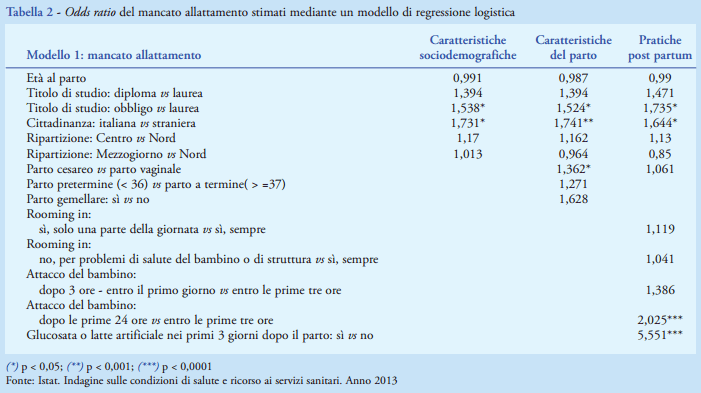 I dati utilizzati derivano dall’indagine campionaria Istat “Condizioni di salute e ricorso ai servizi sanitari”, svolta tra il 2012 e il 2013 con una numerosità campionaria di circa 60mila famiglie. Alle domande sull’allattamento ha risposto un campione di circa 5.000 donne che hanno avuto un figlio nei sei anni precedenti la data dell’intervista, distribuite su tutto il territorio nazionale, che rappresentano complessivamente oltre 2 milioni e 700mila donne residenti in Italia con tali caratteristiche. Per i confronti internazionali sono stati calcolati alcuni indicatori secondo le raccomandazioni dell’OMS; in particolare, per l’allattamento esclusivo, si è fatto riferimento a un quesito sugli alimenti assunti dal bambino nelle 24 ore e nella settimana precedente l’intervista (su un campione di circa 1.800 donne con figli fino a due anni di età). Per l’analisi dei determinanti sono stati applicati modelli logistici multivariati, utilizzando quesiti di tipo retrospettivo, per contenere i problemi di numerosità campionaria.