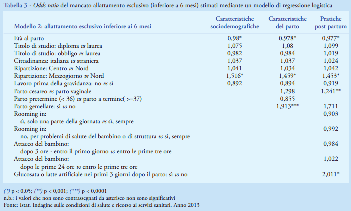 SUMMARY (Assessing breastfeeding in Italy in 2013: the right way to start an healthy nutrition) - In 2013 the Italian National Institute of Statistics carried out a sample survey on health, using World Health Organization definitions and methods. Based on the essential indicators on breastfeeding so estimated, Italy could be placed in an intermediate level, in terms of prevalence and duration, when compared with other countries. The percentage of children 0-24 months of age ever breastfed was 85.5%, with a rate of early initiation of 39.3%; the prevalence of exclusive breastfeeding in infants under 6 months was 42.7%; and the median duration of any breastfeeding was 6 months. These figures hide important regional and social differences. After a more accurate analysis, using logistic regression models, two early post-natal practices showed a negative association with breastfeeding: the use of formula and glucose supplements in the first 3 days, and the delay of the first breastfeed after birth. These practices display large regional differences in Italy.