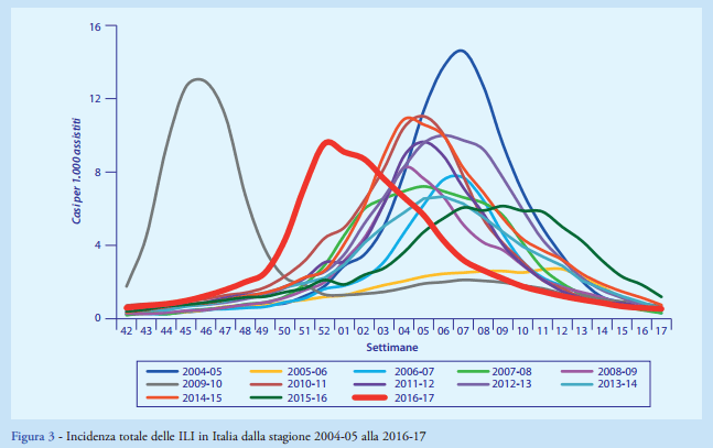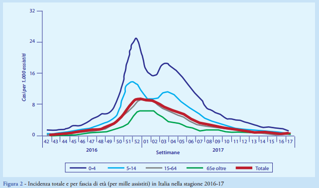 La stagione influenzale 2016-17 è stata caratterizzata da un anticipo della circolazione virale e del picco epidemico di circa 4 settimane, da un improvviso e brusco aumento del numero dei casi di sindrome influenzale e da un elevato e inatteso numero di casi nei soggetti di età pari o superiore a 65 anni rispetto alle scorse stagioni (esclusa la stagione pandemica 2009-10).