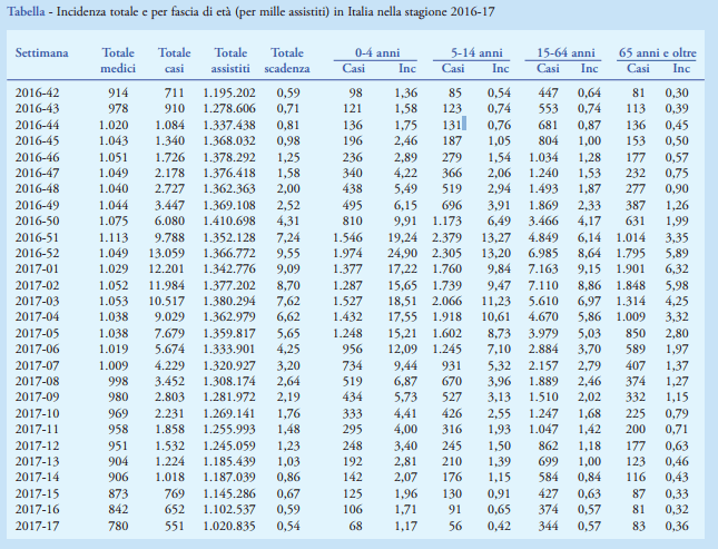 SUMMARY (Epidemiological influenza surveillance in Italy: the results of the 2016-17 season) - Seasonal influenza surveillance is based on a nationwide sentinel surveillance network (InfluNet) combining clinical and virological information. Beginning from the influenza season (1999-2000), sentinel surveillance has become an institutional activity. It is carried out through collaboration of different parties: Regions, Istituto Superiore di Sanità (Italian National Institute of Health), Centro Interuniversitario di Ricerca sull’Influenza e le altre Infezioni Trasmissibili, Interuniversity Research Centre on Influenza and other transmitted infections), reference laboratories, general practitioners and paediatricians under the support of the Ministry of Health. The system is based on sentinel practitioners covering about 2% of the general population, with the aim of monitoring the incidence of medically attended influenza-like illness (ILI), identifying the extent of the seasonal epidemics from week 42 to week 17 of the following year. Data collected through InfluNet are also uploaded weekly into the European database coordinated by the European Centre for Disease Prevention and Control (ECDC). During the 2016–17 influenza season, there were an estimated of approximately 5,440,000 medically attended ILI cases in Italy. The ILI incidence observed was 9.3 cases per 1,00 served population.
