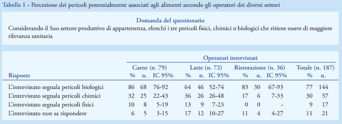 In generale, si osserva un buon accordo nelle risposte ottenute separatamente dagli operatori dei tre settori. Tra i pericoli potenzialmente associati agli alimenti (Tabella 1), gli operatori considerano di maggiore rilevanza sanitaria quelli di natura biologica (segnalati da circa tre quarti dei rispondenti, considerando il dato medio sulle tre filiere); seguono per numero di segnalazioni i pericoli chimici, mentre i pericoli fisici vengono considerati come poco rilevanti da tutte e tre le categorie di operatori. Sempre in relazione alla propria attività produttiva, circa un intervistato su dieci non sa indicare neanche un pericolo che percepisca come rilevante per la salute pubblica.
