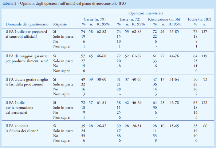 Più di due terzi degli intervistati ritiene che il PA sia utile per superare i controlli ufficiali, ma anche per produrre alimenti sani e per la formazione del personale (Tabella 2); viene invece giudicata limitata l’utilità dell’autocontrollo come mezzo per valorizzare i prodotti agli occhi del consumatore.