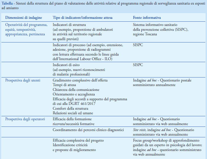 SUMMARY (Definition of a performance assessment plan of the health surveillance programme for former asbestos workers in Tuscany Region, Italy) - In Tuscany Region (Italy), a public programme aimed at providing health surveillance for former asbestos workers recently started, following a common approach to asbestos-related diseases as defined by a regional group of experts. A performance assessment plan of the post occupational surveillance programme was drafted by the Institute for Study, Prevention and Cancer Network, and discussed within the Regional Committee, in order to monitor its equity, accessibility and to improve its effectiveness.The performance evaluation plan, partly designed with the PRECEDE-PROCEED model, provides for the periodic assessment of: structure, process and outcome indicators, obtained by the programme database; health care workers’ and patients’ perspectives, obtained by two specific questionnaires. Site visits over the regional facilities will also be performed as a tool for peer training. Expected benefits of the performance evaluation of this programme are multidisciplinary interactions between professionals, the development of audit techniques during site visits, the adequate and fair management of health needs and continuous training of involved healthcare personnel.