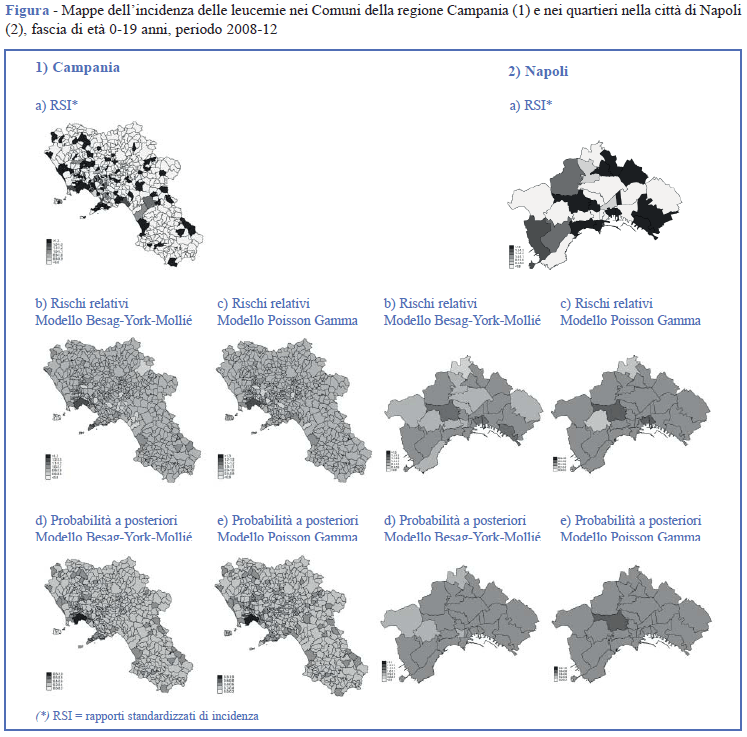 Il rischio di leucemie infantili in Campania è stato rappresentato attraverso la produzione di mappe che riportano la distribuzione spaziale, su base comunale, di tre diversi indicatori di rischio: i rapporti standardizzati di incidenza (RSI) e i rischi relativi bayesiani stimati con i modelli gerarchici Poisson Gamma (PG) e Besag York Mollié (BYM).