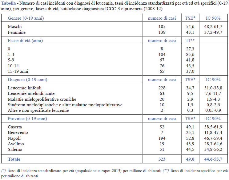 Nel periodo 2008-12, sono state registrate tra i residenti campani di età inferiore ai 20 anni 323 nuove diagnosi di leucemia, con un tasso di incidenza standardizzato nei maschi pari a 54,6 casi per milione e nelle femmine pari a 43,1 casi per milione (rapporto maschi/femmine 1,3). Le leucemie linfoidi acute rappresentano la diagnosi più frequente (71%), seguita dalle leucemie mieloidi acute (21%). Rispetto all’età di insorgenza, le leucemie raggiungono il tasso di incidenza più alto nella fascia 1-4 anni (85,6 casi per milione), in accordo con il picco di incidenza delle leucemie linfoblastiche acute in questa fascia di età. Il tasso di incidenza fra i residenti con età compresa tra 0 e 19 anni, nelle province della Campania, varia tra 25,1 casi per milione nella provincia di Benevento (calcolato su 7 casi osservati) e 52,8 casi per milione nella provincia di Napoli (calcolato su 194 casi osservati) (Tabella). Nella rappresentazione geografica dell’incidenza di leucemie su base comunale analizzata con gli RSI, si osserva una grande instabilità delle stime: il range varia tra 0 (in 411 Comuni non sono stati osservati casi incidenti nel quinquennio 2008-12) e 33,3. In sette Comuni l’RSI è maggiore di 1 e raggiunge la significatività statistica; tra questi solo la città di Napoli presenta almeno 3 casi osservati nei cinque anni (Napoli: casi osservati 72; RSI = 1,39; intervallo di confidenza 90% = 1,13- 1,69). In nessun Comune è stato osservato un rischio significativamente più basso rispetto alla media regionale.