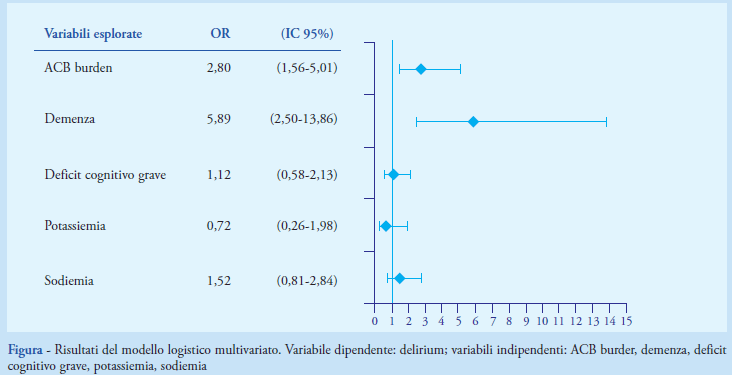 Per correggere l’influenza di diversi fattori tra la variabile ACB burden e altre variabili (demenza, deficit cognitivo grave, po-tassiemia e sodiemia), è stato utilizzato un modello di regressione logistica che ha confermato l’associazione statisticamente significativa tra ACB burden (p 0,0005) e delirium. Inoltre, la regressione logistica evidenzia anche un’associazione significativa tra la variabile demenza (p 0,0000) e delirium (Figura).