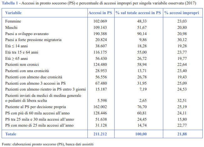 SUMMARY (The role of Emergency Department non-urgent visits in province of Bolzano) - The Emergency Department (ED) is frequently identified as possible solution for all health care problems; hence, there is a risk that the percentage of inappropriate or non-urgent visits plays a key role in overcrowding at ED. The high ED admission rate in the province of Bolzano consists of around 20% of inappropriate visits; this is probably caused by critical issues in the primary care system, such as lack of primary care centers and low collaboration with the physicians in the area. Our analysis showed that the inappropriate ED visits involve all the patients, except younger age groups, and in particular patients suffering from non-chronic conditions, patients from Countries with a strong migratory pressure and patients with more than three visits. Furthermore, inappropriate ED visits are more frequent in the ED with a greater number of admissions.