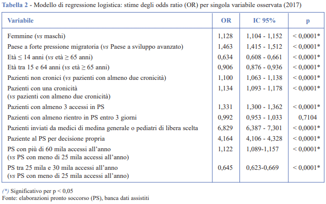 I dati sugli accessi in PS, relativi all’anno 2017, sono stati estratti dalla banca dati del flusso ministeriale. Gli accessi impropri sono stati definiti sulla base dei seguenti criteri ricavati da uno studio italiano condotto nel 2008: tutti gli accessi della popolazione residente esclusi gli abbandoni, con codice triage infermieristico bianco, con codice triage infermieristico verde non associato a eventi traumatici, dimessi a domicilio e con orario di accesso dalle 8 alle 20 di un giorno compreso tra lunedì e venerdì (5). Gli accessi sono stati poi suddivisi sulla base di variabili demografiche, quali sesso, cittadinanza (se Paese a sviluppo avanzato oppure Paese a forte pressione migratoria) ed età (da 0 a 14 anni, da 15 a 64 anni ed oltre 65 anni), variabili legate all’accesso (pazienti con più di 3 accessi, con almeno un rientro entro 3 giorni dall’accesso precedente, pazienti inviati dall'MMG o dal pediatra di libera scelta - PLS, pazienti con decisione propria), variabili legate alla struttura di PS (più di 60.000 accessi all’anno, tra 25.000 e 30.000 accessi all’anno, meno di 25.000 accessi all’anno) e variabili cliniche (senza cronicità, con una patologia cronica, con due o più patologie croniche), identificati attraverso il progetto “Mappatura delle patologie croniche” che, sulla base di informazioni anagrafiche epidemiologiche ed economiche relative a ciascun assistito, ha definito 14 profili di cronicità differenti, tra cui il diabete, la broncopneumopatia, lo scompenso, le demenze e le neoplasie (6). Sulla base di un modello di regressione logistica, sono stati poi stimati gli odds ratio (OR) per ciascuna delle variabili definite in precedenza, al fine di valutare la propensione al rischio di un accesso improprio (7).